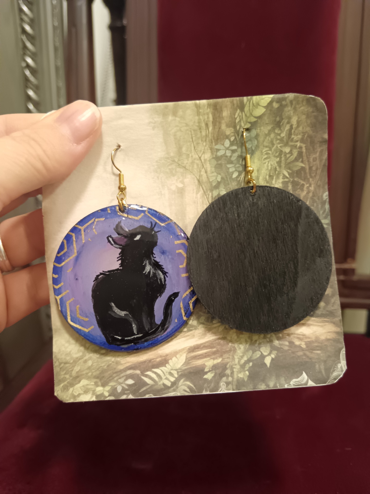 Käsin, akryylivärein vanerille maalatut korvakorut.