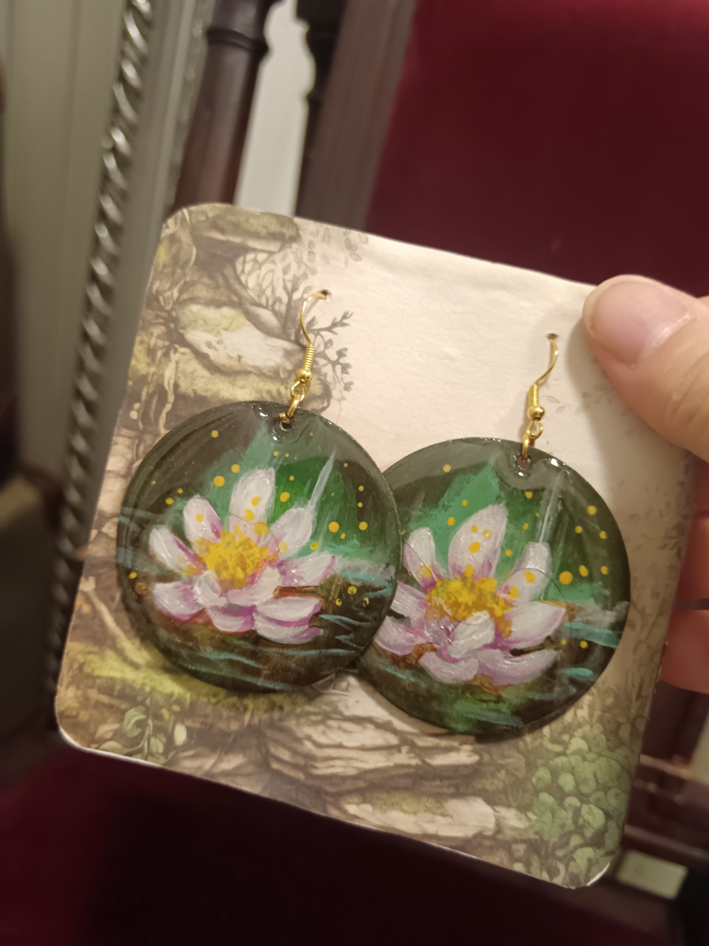 Käsin, akryylivärein vanerille maalatut korvakorut.