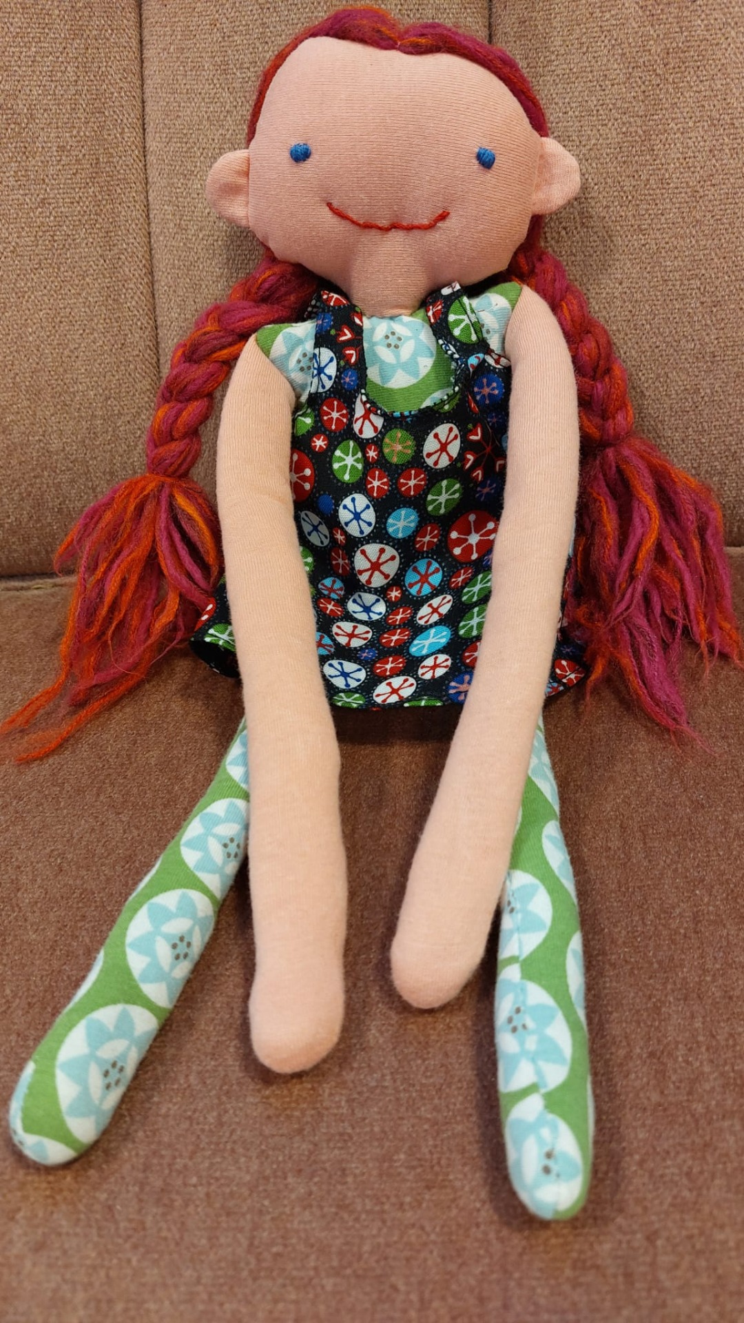 Vekkuli punapäinen molla. Korkeus 40 cm. Trikoota, kirjailtu naama, lankatukka, puuvillamekko. Sisukset polyesterivanua.