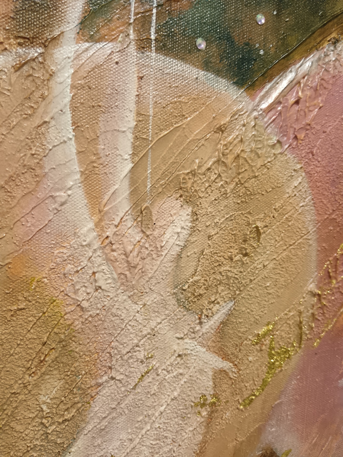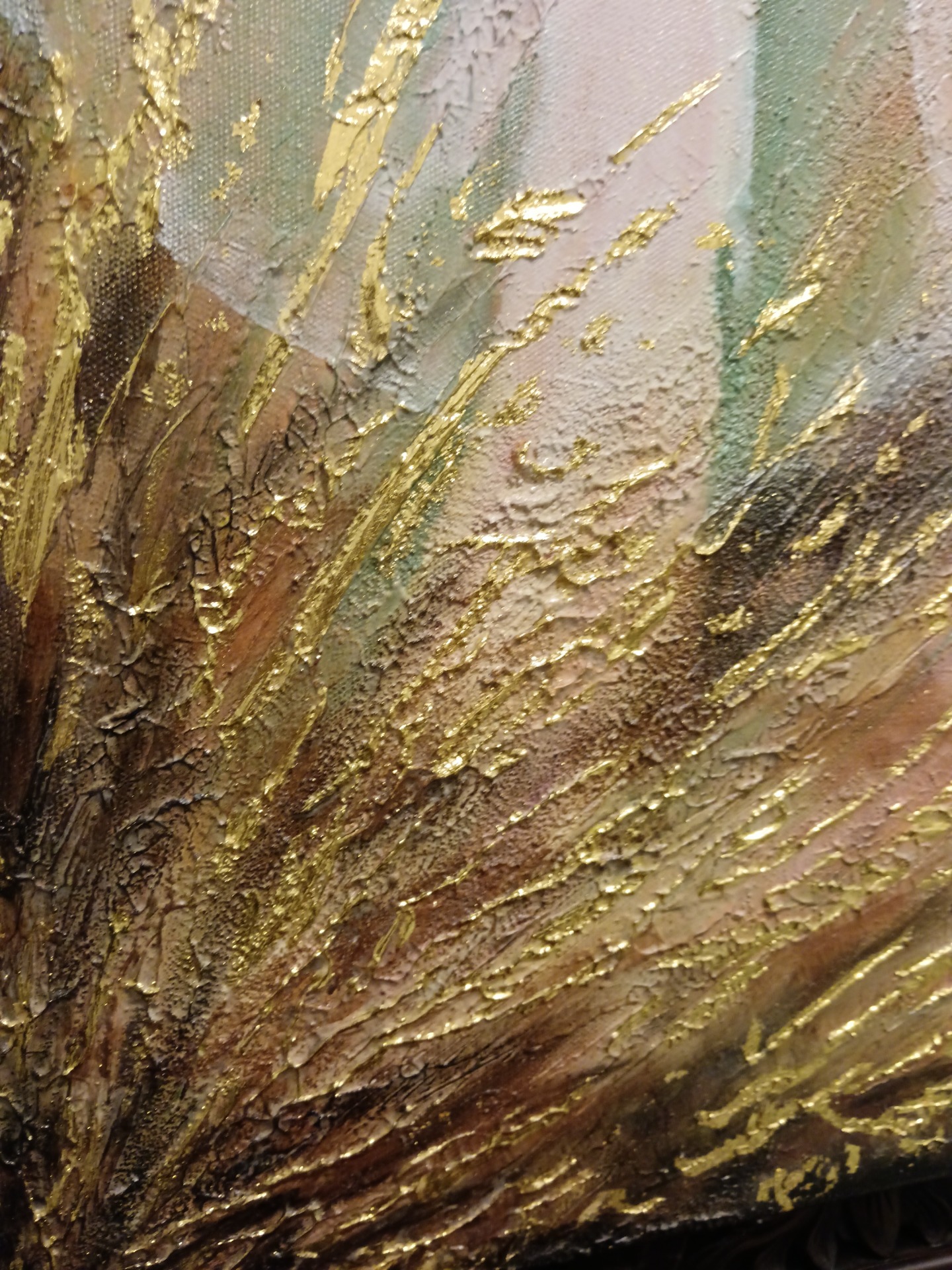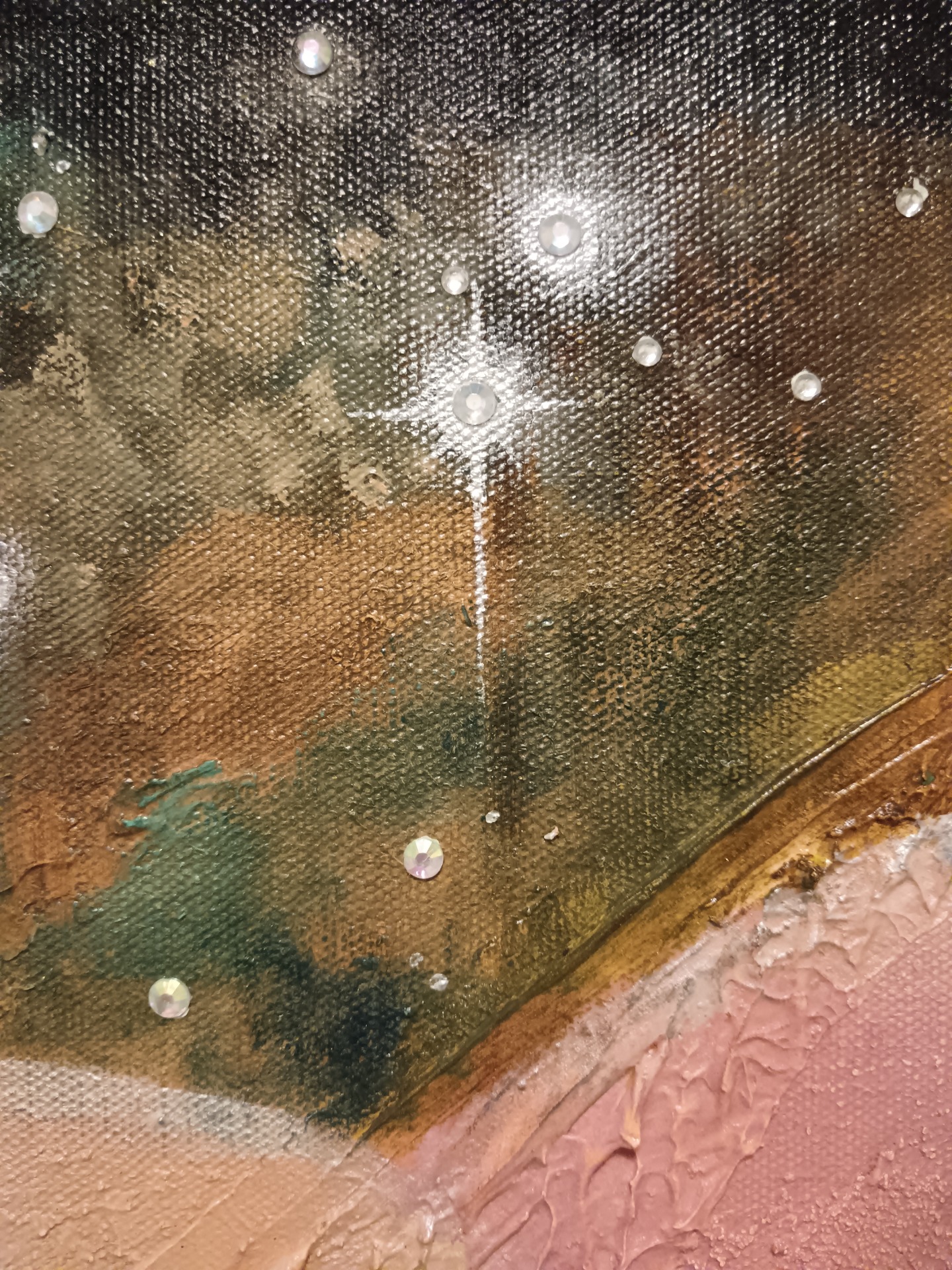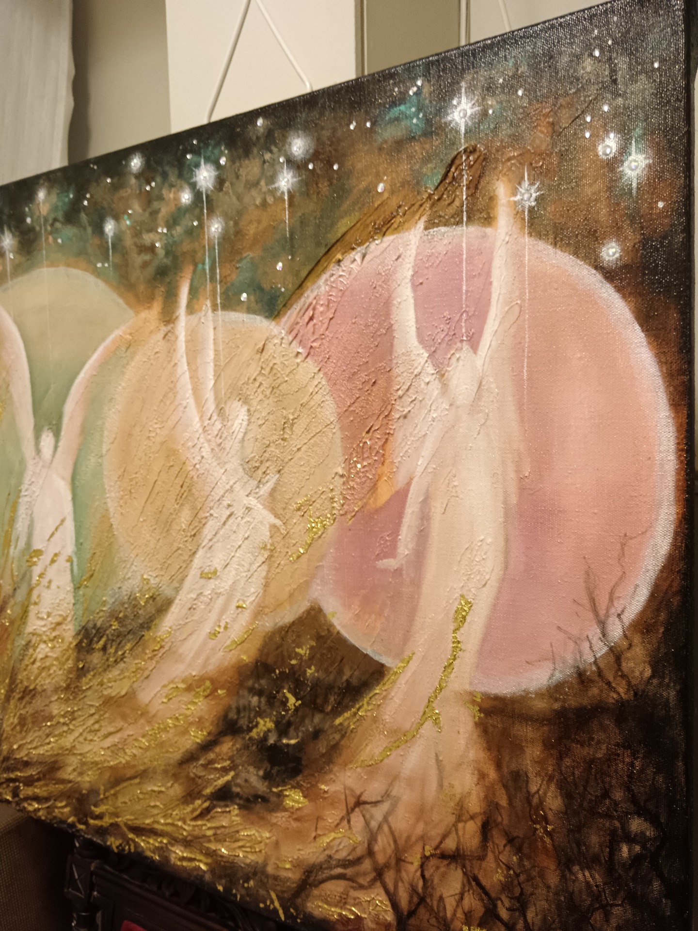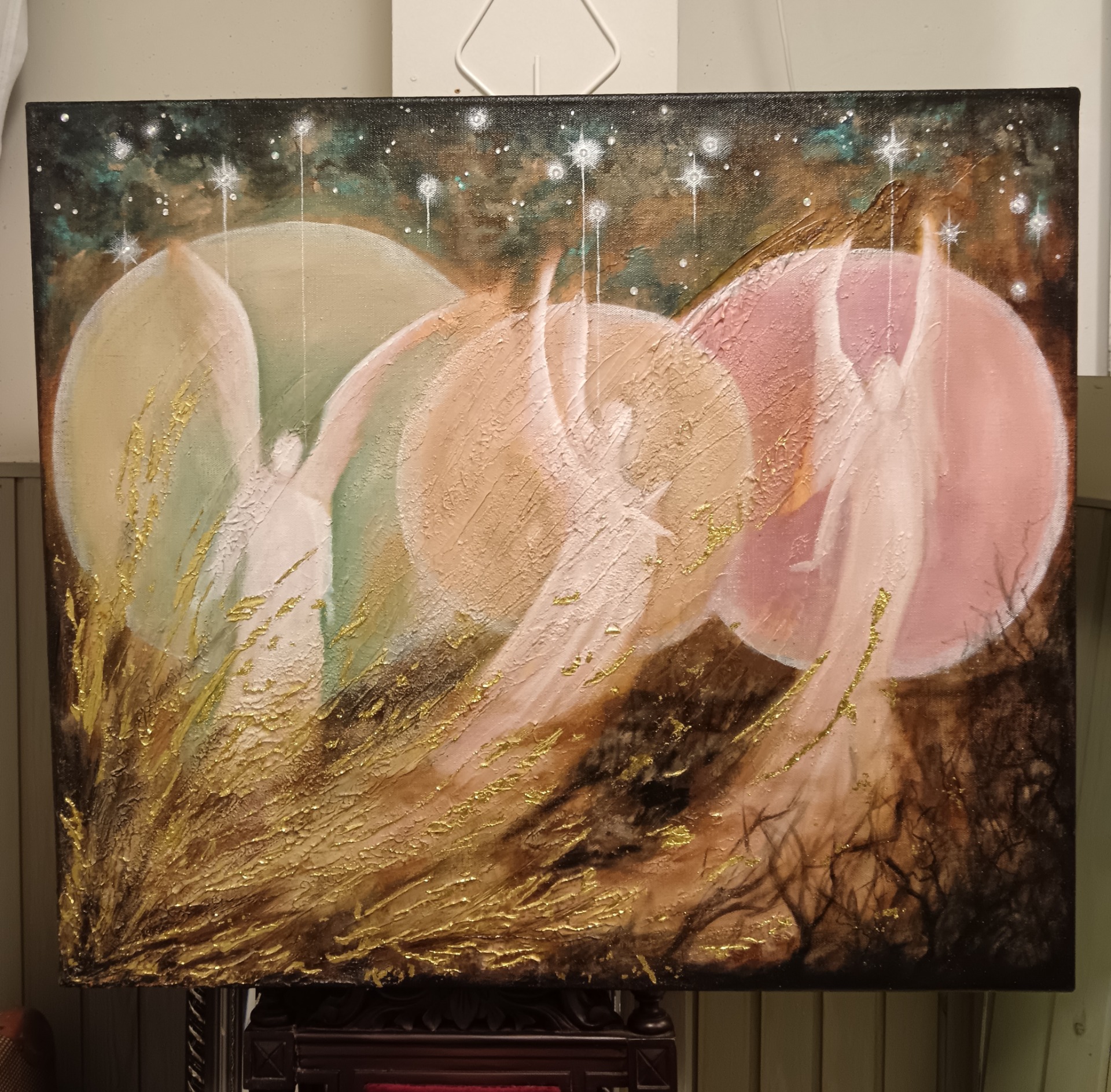 Akryylivärit, lehtikulta ja akryylitimantit.Pinnassa kiiltävä vernissa.